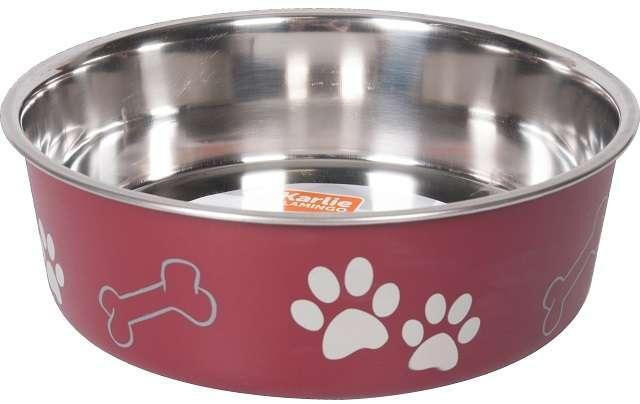 Kutyák részére kialakított, mintás, rozsdamentes fémtál, peremmel.