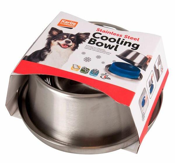 A tál 3 részből áll: fém tál, fém csúszásgátló alj és kék színű hűsítő betét Használat a: A fém rész alatt egy hűsítő betét található, mely hasonló módon működik, mint a hagyományos hűtőtáskák. Vegye ki a betétet és helyezze 30 perc- 1 óra időtartamra a hűtőszekrénybe. Ezt követően vegye ki és helyezze be a tál fém része alá és töltsön a tálba hideg vizet. Helyezze a tálat árnyékos helyre, ahol a hűsítő hatás hosszabb ideig tart. Ügyeljen rá, hogy kutyája ne rágja meg a hűsítő betétet, mivel az egy speciális folyadékkal van töltve, mely veszélyes lehet a kutya számára - amennyiben arra gyanakszik, hogy kutyája fogyasztott ebből a folyadékból, azonnal vigye őt állatorvoshoz! A sérült hűsítő betétet dobja el és vásároljon egy másik tálat (a régi tál használható a hűsítő betét nélkül is hagyományos fém itatótálként). Térfogat: 820 ml